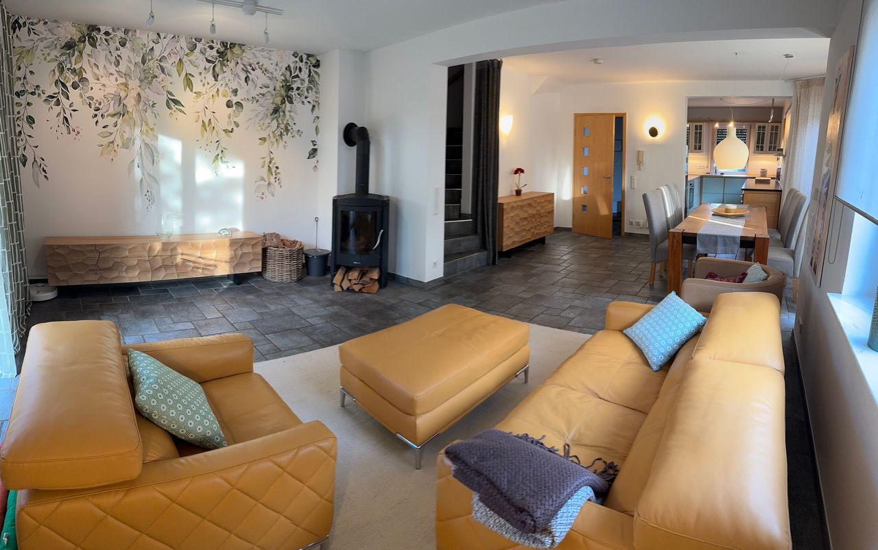For fans of the minimalist Japanese/Scandinavian (Japandi) style of furnishing, our house is just the right place to relax and feel completely at ease. The exclusively furnished 5-room house with garden has - a fully equipped kitchen - a light-flooded dining room, - a living room with a wood-burning stove, - 3 double or twin bedrooms with box-spring beds, - a large bathroom with shower and bathtub and - a separate guest toilet in the entrance area. The he bright and light-flooded house wa...