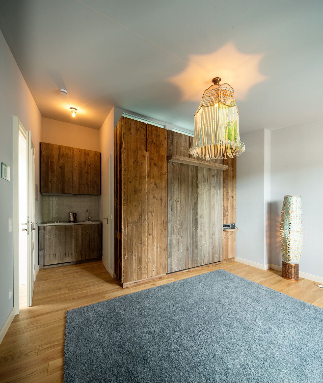 Fireplace and living room with illustrations by Kathi Käppel, open kitchen & dining room for individual cooking evenings, own cinema with small bar, laundry room, fitness room & yoga classes, room with kitchenettes, enchanted garden & roof terrace, distinctive residents, contemporary art & old stucco. Those happy to trade a short stair climb for a private view of Frankfurt’s skyline will enjoy the top floor suite. This room has been kept deliberately bright, with sun-bleached spruce adorning th...