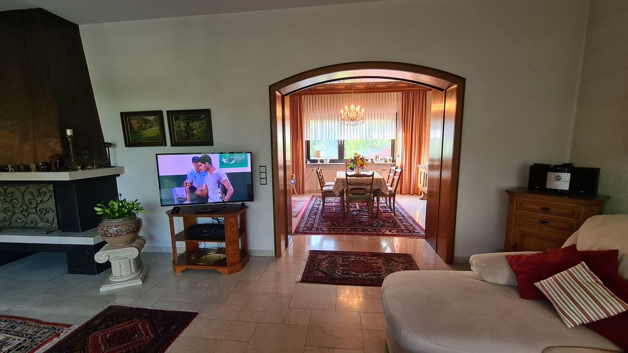 The villa in Frankfurt (Bergen-Enkheim) is located directly at the nature reserve Enkheimer Ried. The dream house with 270 m² living space is equipped with marble, tile and carpet floors. The house shines with a beautiful, large loggia, a large fireplace in the living room (first floor) and a sauna (2nd basement). The house has a full basement, a laundry room in the basement, an underground parking space and a garden in front of the house.