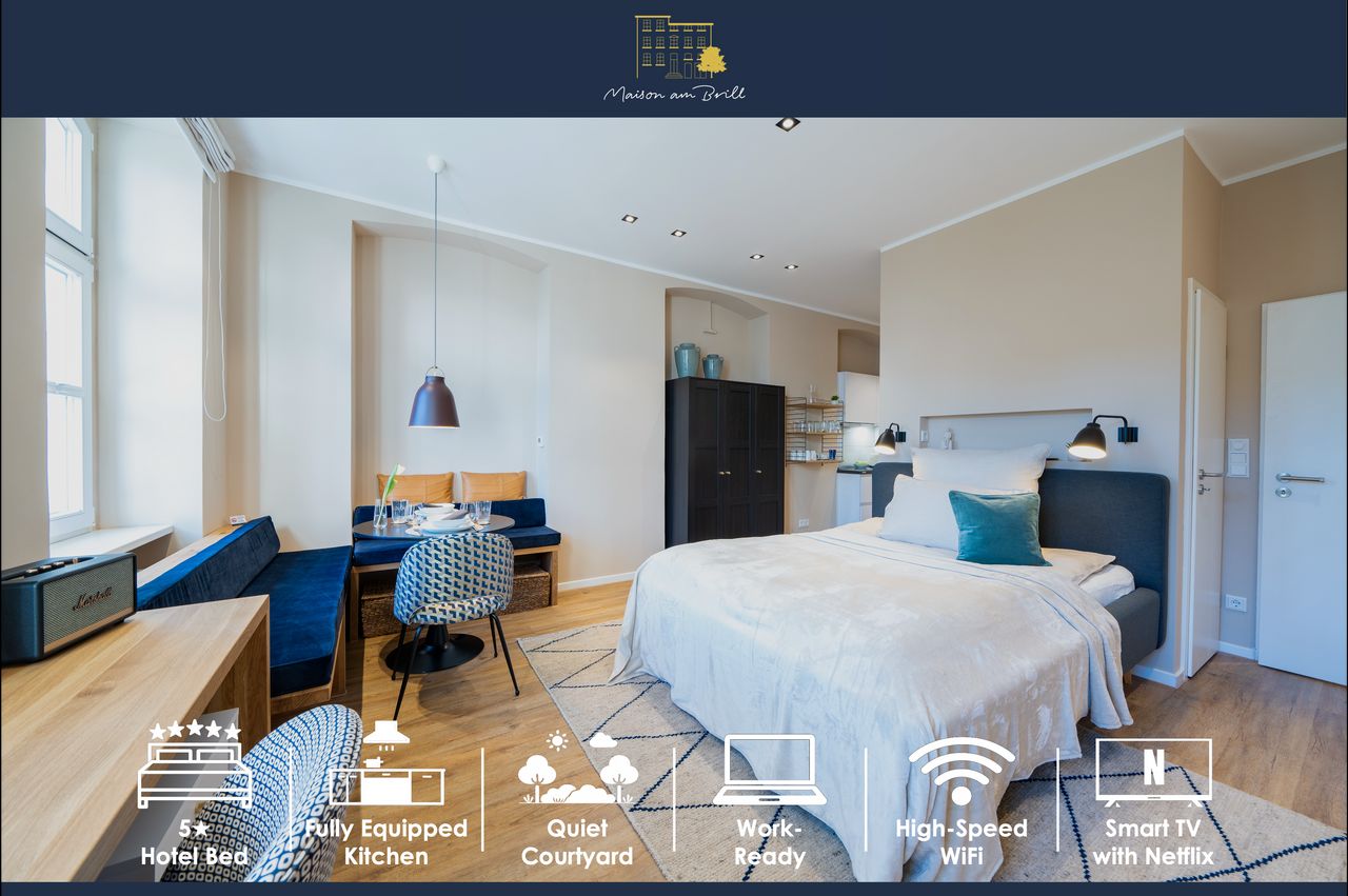 The Maison am Brill is ideally located between the prestigious Briller district, renowned for its beautiful historic villas, and the vibrant Luisenviertel, offering a wide range of restaurants, small boutiques, and lively nightlife. This unique position combines elegance, urban life, and convenience. Set within a quiet, green courtyard, the apartment offers a peaceful retreat away from the bustle of everyday life — right in the heart of Wuppertal’s city center. Here, you can enjoy both tranquil...
