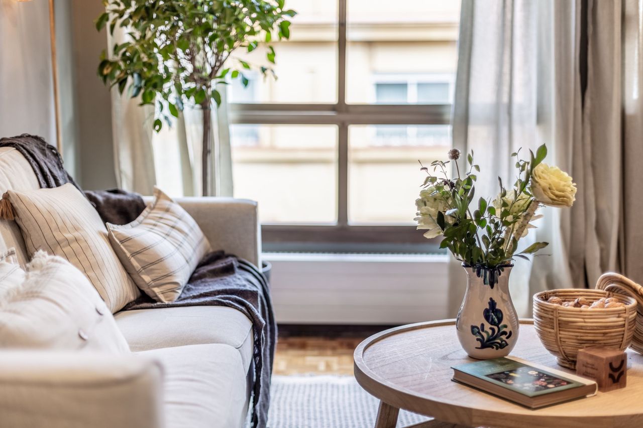 This 75 square meter apartment combines rustic materials with modern finishing to create a unique grassland design. Located in Madrid’s hip and historic Almagro neighborhood, the property features 1 bedroom and 2 bathrooms. The bedroom includes a queen-sized bed, a bright window, and large storage, with a dedicated office space separated by a retractable wooden door. The open-plan living, dining, and kitchen area is decorated with dried plants and comes fully equipped with all necessary applianc...