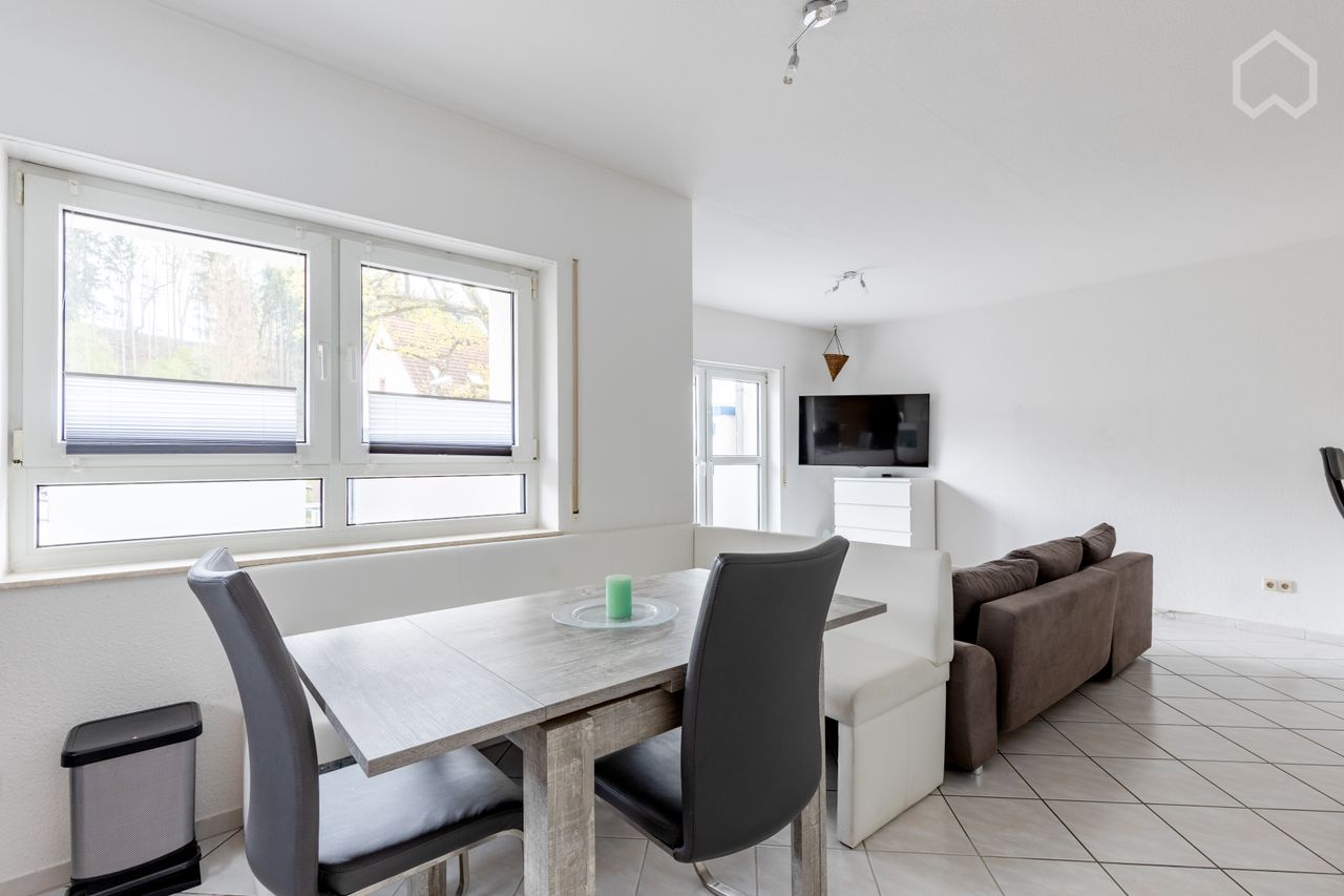 Quietly located, in the middle of a beautiful natural landscape and yet very close to Kaiserslautern with very good bus connections and links to various highways. The bus stop is only a minute walk away on the main road. The bus runs regularly (every 30min) to Kaiserslautern. (10min approx) On weekends there is even bus late at night from the city center to Erlenbach. High speed internet with an available desk is also available. The apartment has a covered terrace and an open terrace right outsi...