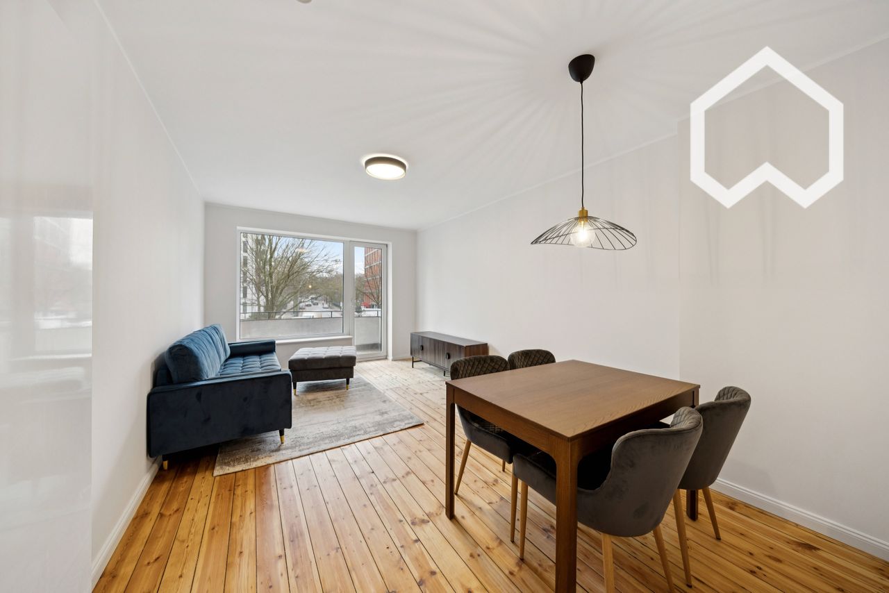 This modern, stylishly furnished loft in Hamburg-Winterhude offers comfortable urban living in one of the city’s most sought-after neighborhoods. The open layout creates a spacious feel and is complemented by clean lines and contemporary furnishings. A private balcony extends the living space outdoors, while the ergonomic home office setup provides a comfortable environment for remote work. The bathroom with bathtub adds an extra touch of comfort. The apartment is ideal for professionals or ex...