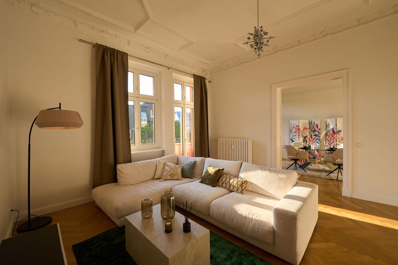 Description de l'objet Cet appartement mansardé unique en son genre est situé dans une rue latérale calme et dans un superbe quartier derrière le KaDeWe, près du Kurfürstendamm. C'est donc dans l'un des quartiers les plus populaires de Berlin que se trouvent de nombreux restaurants et cafés ainsi que des magasins. Il est également bien desservi par les transports en commun et l'autoroute. L'appartement de 120 m² avec ses 4 pièces spacieuses dispose d'une petite terrasse sur le toit avec une vu...
