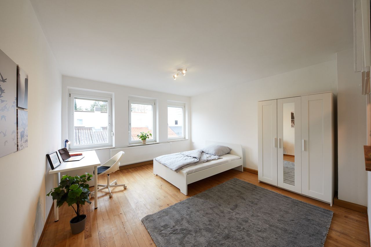 Room size: 19 m² | Total size of the apartment: 46 m² Video tour (copy link): https://photos.app.goo.gl/SbXpXWPTDhEybERh7 - Furnished room in charming shared flat for 2 people - Business shared flat with a focus on respectful behavior - First occupancy after renovation! New furniture, new kitchen, new bathroom! Location / Distances: - Very central but in a quiet side street - Supermarkets (Edeka, Rewe) 2 min walk - Cafés, restaurants, hairdresser: 1-2 min walk - Streetcar stop: 1 min walk (...