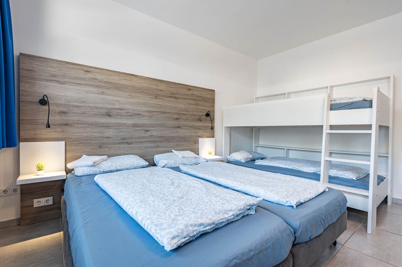Welcome to MK Hostel Oyten — a modern, well-maintained hostel with a spacious 4-bed room for up to 4 guests. The room features a double bed with reading lights and nightstands, plus a bunk bed, wardrobe, two desks, office chairs, and flat-screen TV. Ideal for work colleagues or small groups. Free parking on site. A coffee machine is available in the common area. Self check-in via key box — flexible and contactless, 24/7.