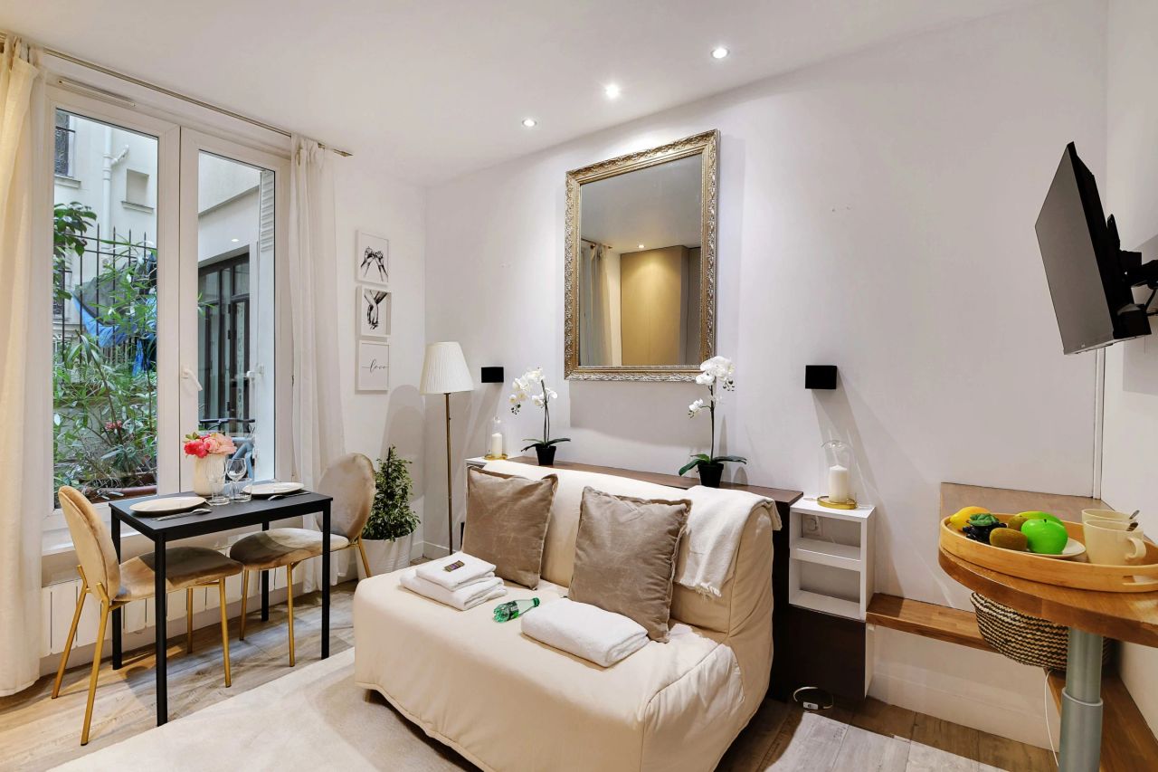 Il s'agit d'un studio de 22m2 situé au rez-de-chaussée, donnant sur une très jolie cour. Il se compose de : Un salon avec une table dinatoire et un canapé lit Une cuisine américaine équipée (réfrigérateur, plaques à induction, micro-ondes, bouilloire, toaster, etc) Une salle de bain avec une baignoire avec un toilette Nombreux rangements Une télévision et internet haut débit (wifi) Draps et serviettes de toilette fournis