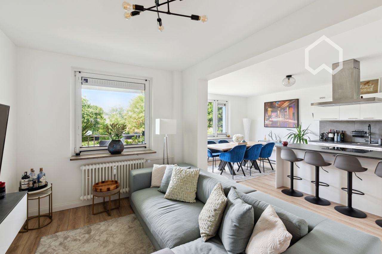 Please welcome this beautiful, sunny 4-room apartment located in the peaceful district of Hamburg-Rahlstedt. This meticulously designed apartment offers a spacious and open layout, providing a comfortable and stylish living space for you and your family. The major room boasts an open-plan design that seamlessly combines three distinct zones. The fully equipped kitchen features a modern cooking island, allowing you to prepare delicious meals with ease. Adjacent to the kitchen is an incredible di...
