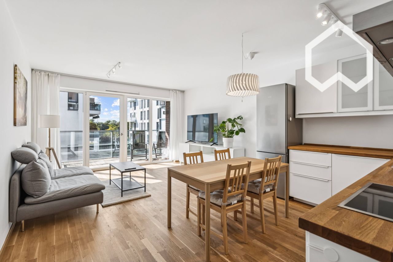Modern riverside apartment (81 m², built in 2018) with 2 bedrooms, 2 bathrooms, spacious living room with open kitchen and balcony. Fully furnished incl. 1000 Mbit/s high-speed internet, washing machine and all utilities – perfect for expats, researchers or colleagues.