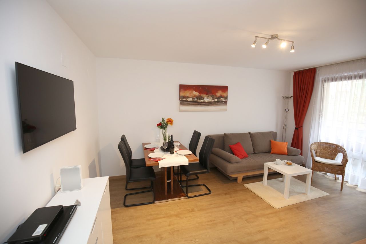 This 2-room apartment, which consists of entrance hall, living room with bed couch 160x200, bedroom with double bed 180x200, bathroom/ WC and loggia, offers fully furnished accommodations on the second floor including lift, for a maximum of 4 guests. There is a fully furnished kitchen in the apartment including a microwave oven, dishwasher and refrigerator, wireless internet free of charge, flat screen HD/TV, DVD player,... which allow a fulfilling sojourn in one of the most beautiful cities of ...