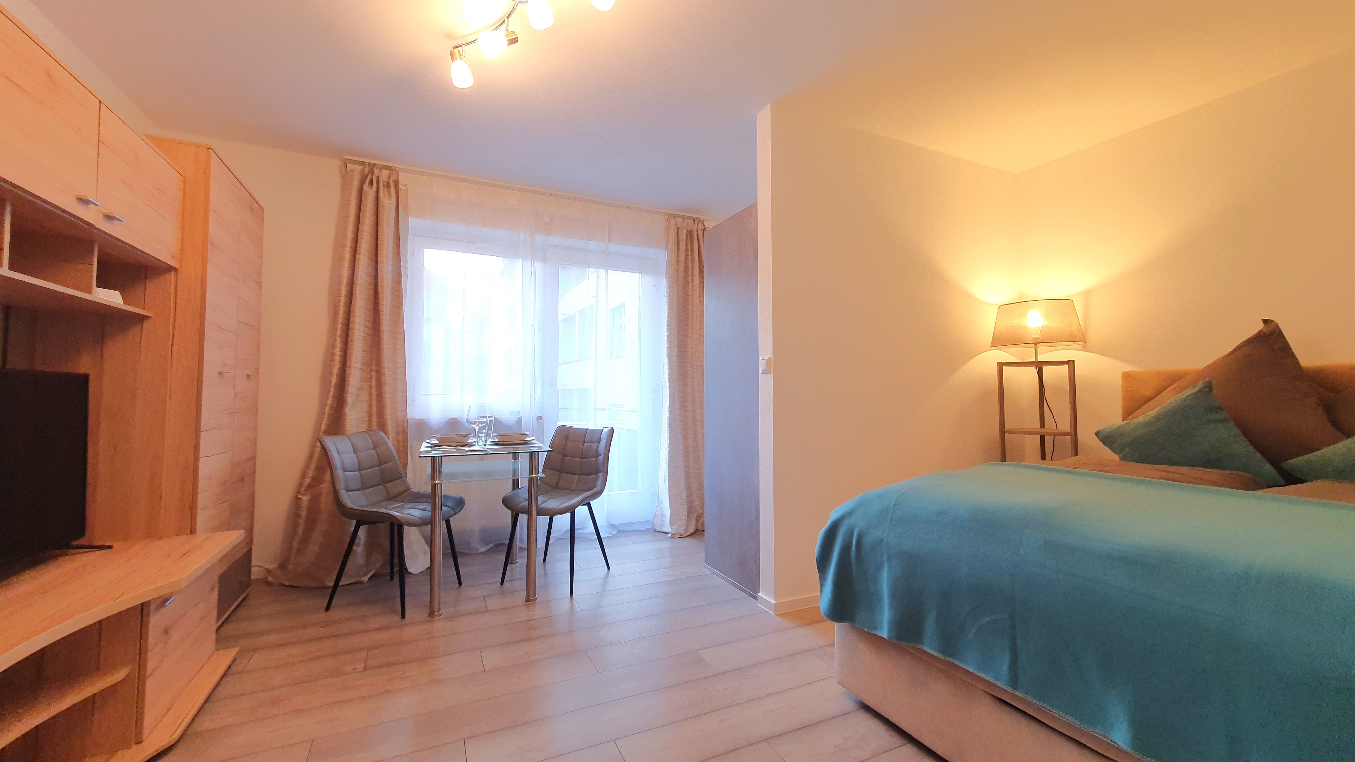Fully equipped 1-room apartment including parking space, 5 minutes to Mercedes Benz, 15 minutes to the center