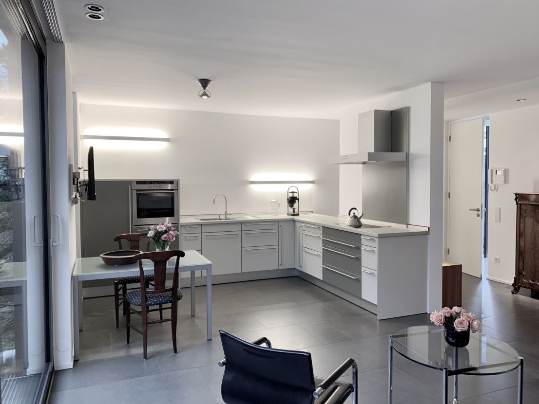 *english* The apartment is located on the 1st floor of a modern and well-kept private house in the Rodenkirchener Auenviertel, 400 m from the idyllic banks of the Rhine. A private staircase with a view into the park-like garden of the property leads to the open-plan apartment. It is furnished to a high standard with a mixture of antiques and modern design classics and has a fully equipped Bulthaup kitchen, balcony, bathroom with rain shower and separate toilet, bedroom with double bed and spaci...