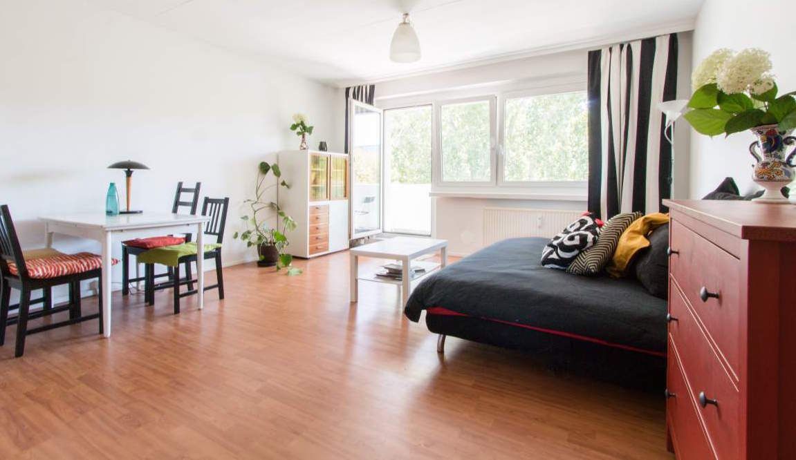 60 sq. mt flat with spacious loft feeling. 4th floor, sunlight all around, with views to tree canopies to both sides. Living room-kitchen with balcony & sofa double bed. Plus 2 private rooms with double beds & cupboards. Bathroom w/ bathtub. Modern fully fitted kitchen & washing machine. Ideal for 2 to max 5 guests. Situated in front of Prenzlauer Berg Park, crosspoint between Friedrichsain & Lichtenberg. All services included. 15' tram to Alexander Platz, 7 mins walk to Circle line.