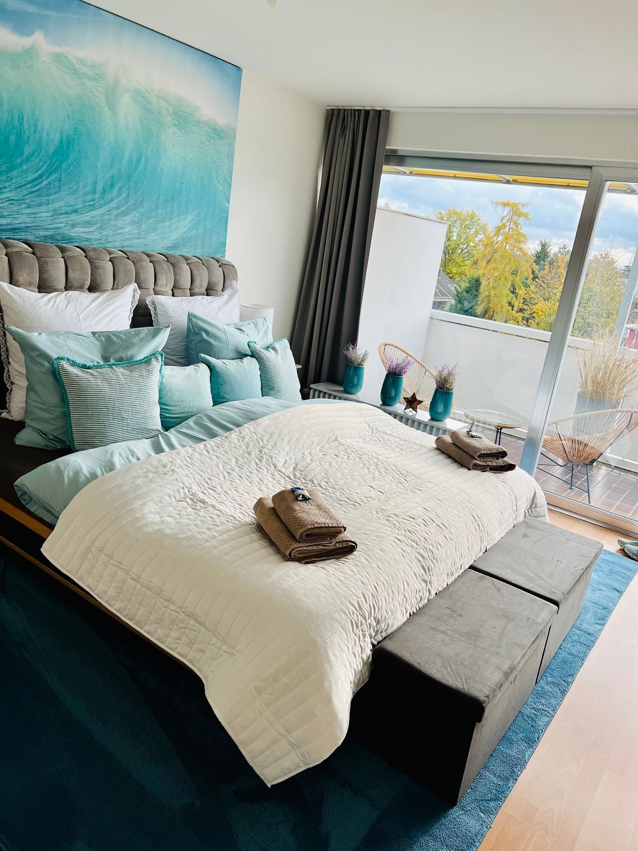 The apartment is located in a small residential unit of 13 apartments. It is located in the middle of Aachener Straße and is quiet due to the location at the back. You can reach the fourth floor by elevator. Once inside the apartment, you will find a bright and friendly living ambience, which is supposed to remind you of vacation & relaxation due to the sea colors. That's why it got its name "Wave". The furnishings were chosen quite thoughtfully. Here, attention was paid to the function as w...