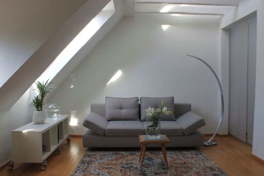 *English* This bright and stylish apartment with loft character is modern and furnished with antique accents. The comfortably furnished gallery with view into the living room invites you to relax. The spacious dining area is equipped with a modern fitted kitchen. Opposite the bedroom is a large and tasteful daylight bathroom with shower. Equipment - Fitted kitchen with all electrical appliances and complete kitchen inventory - box spring bed (1.40 x 2 m), wardrobe, chest of drawers - daylight...