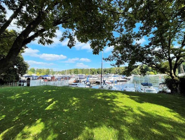 A beautiful maisonette apartment in a quiet location directly on Lake Pichelssee in Berlin Spandau with a view of the water. Use of the garden is possible, and a barbecue area is available. Two parking spaces in the underground garage and a boat dock are also available for rent. The lower level of the apartment includes the entrance area with the stairs leading upstairs, a bathroom, a living room, a kitchen, and a large terrace overlooking Lake Pichelssee. The large sofa folds out into a double ...