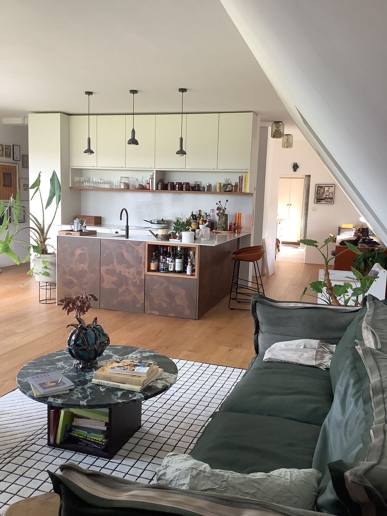 Starting in October, we are offering our open-plan attic apartment for a 3-month sublet. This high-quality apartment impresses not only with its well-thought-out layout but also with its designer furnishings. Apartment Highlights: -Open floor plan with a spacious living and dining area, perfect for modern living needs. -Large rooftop terrace (approx. 25 sqm) with a wide view – ideal for relaxing evenings. -High-end fitted kitchen with top-of-the-line appliances, including a Quooker tap. (spark...