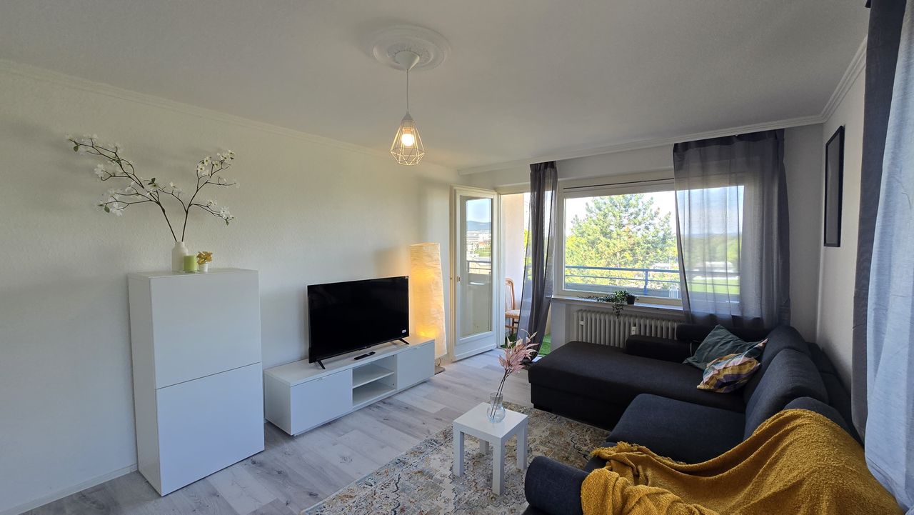 Welcome to your new home in Eschborn — a bright, fully furnished 2-room apartment, ideal for expats, professionals, or couples working in Frankfurt, Eschborn, or the surrounding area. **Apartment Highlights: • 57 m² | Living room + bedroom • Stylishly furnished: queen bed (180×200 cm), wardrobe, sofa, extendable dining setup • Fully equipped kitchen: dishwasher, oven, stove, fridge/freezer • Washer-dryer (8 kg) in-unit • 50” Smart TV (living) + 32” TV (bedroom) • Balcony with artificial gr...
