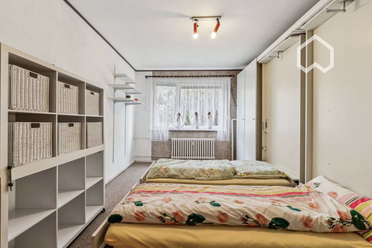 This furnished apartment offers peaceful living in a green neighborhood, just a 5-minute bus ride from Bahnhof Spandau for excellent connections. A parking space is included. Details: - Size: 83 m² - Layout: 3 rooms (bedroom, guest room, living area), 1 bathroom, 1 guest toilet - Bedroom: Large double bed - Guest room: 2 practical single beds that fold out from the dresser (1 shown unfolded in photos, 1 stored inside) - Features: - Spacious balcony overlooking quiet surroundings...