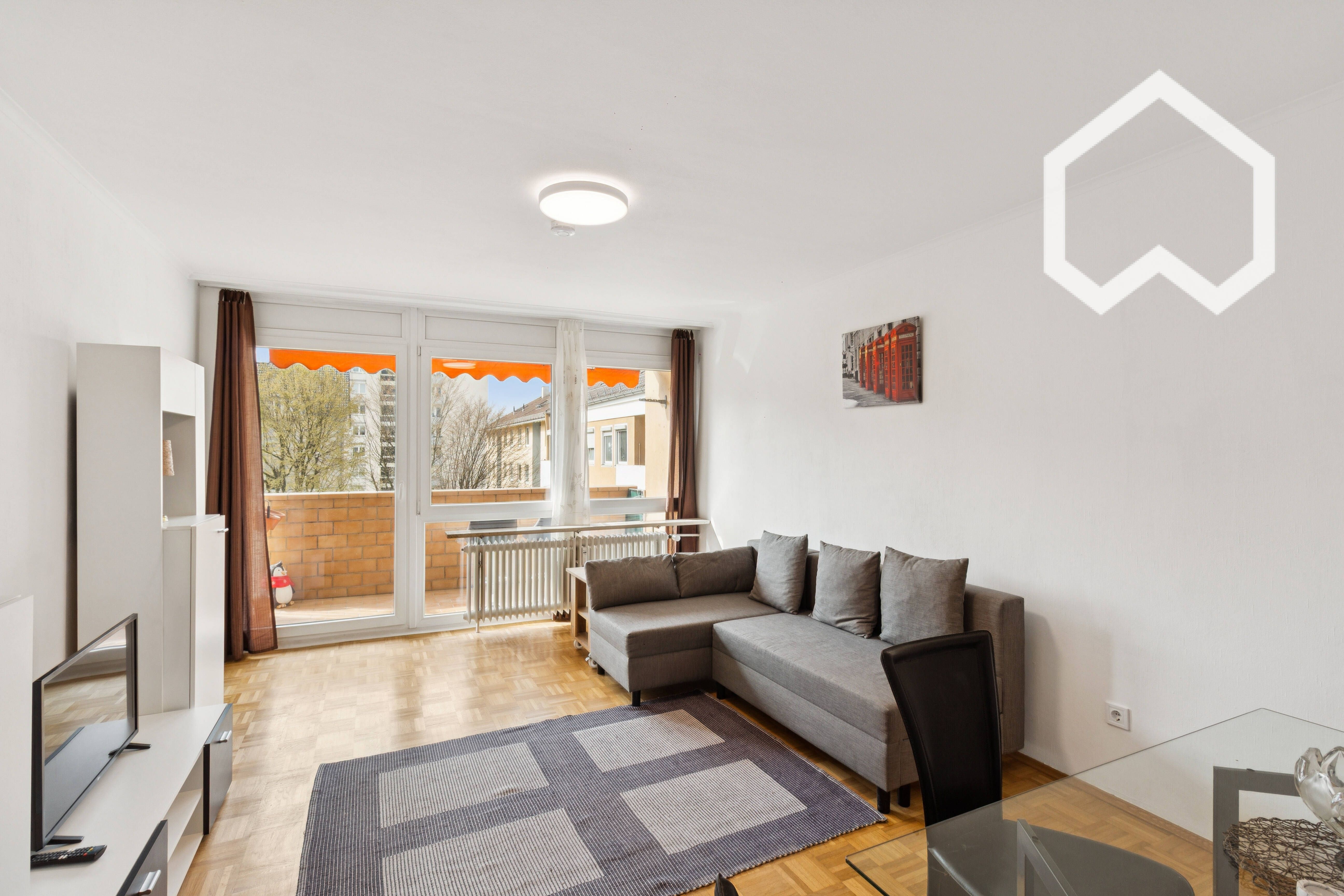 Newly renovated: Sunny studio apartment with a south-west-facing balcony, swimming pool, and sauna in Munich