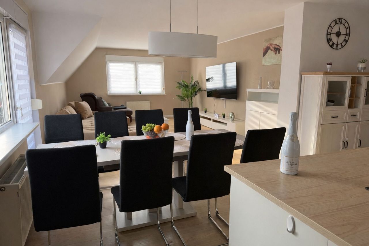 A spacious 4-room apartment with approximately 140 square meters of living space is available for rent. The apartment is fully furnished and features a dreamlike roof terrace as well as a garden area of about 500 square meters with a barbecue corner. The total rent is 3,500 euros per month and also includes hot water and internet. The location in Berlin-Spandau, district Hakenfelde, offers excellent connectivity: the B5-Center can be reached in about 30 minutes. A kindergarten is just a two-minu...