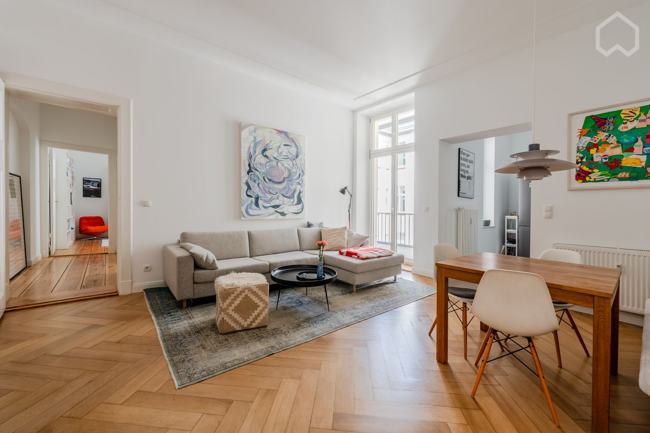 A Berlin address that delivers in every aspect – without the usual trade-off between location and quality of life. This fully furnished 81 m² three-bedroom apartment is set in the quiet rear wing of a classic Wilhelminian building in Charlottenburg-Wilmersdorf, one of Berlin's most sought-after neighbourhoods for business travellers and expats. With 3.40 m ceilings, original herringbone parquet, curated art and designer furniture, this is a home that feels like one from day one. The Kurfürstenda...