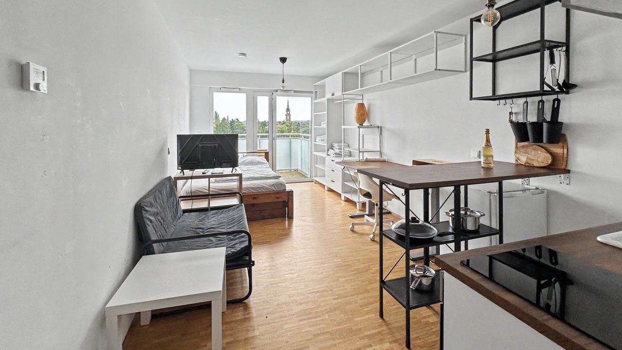 Bright, modern furnished studio apartment with an industrial touch on an upper floor. The 35 m² apartment features a spacious open-plan living, sleeping and kitchen area with parquet flooring and plenty of natural light through the balcony door with views over the treetops. The fully equipped kitchen includes an oven and induction hob. The modern bathroom features a walk-in glass shower, heated towel rail and washing machine. A private balcony completes the apartment.