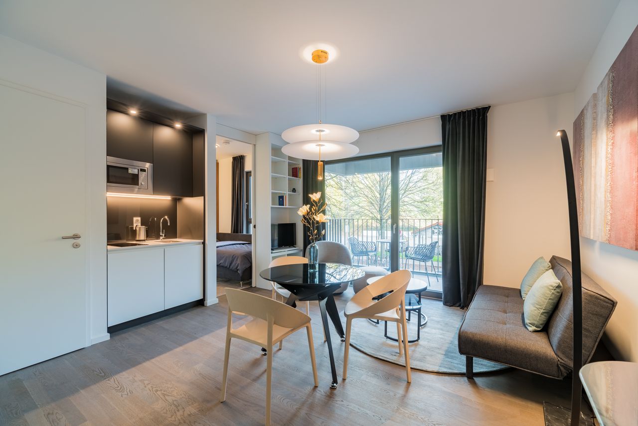 Amenities Very high-quality furnishings The bed has been replaced with a larger bed (140 × 200 cm) Kitchenette with refrigerator, freezer compartment, induction cooktop, microwave and coffee machine Oak parquet flooring with underfloor heating Floor-to-ceiling wooden windows Electrically operated blinds Tiled bathroom with walk-in shower and washing machine 5 m² balcony Bicycle parking in the courtyard Additional information High-speed internet (fiber optic) included A flat-rate advance payme...