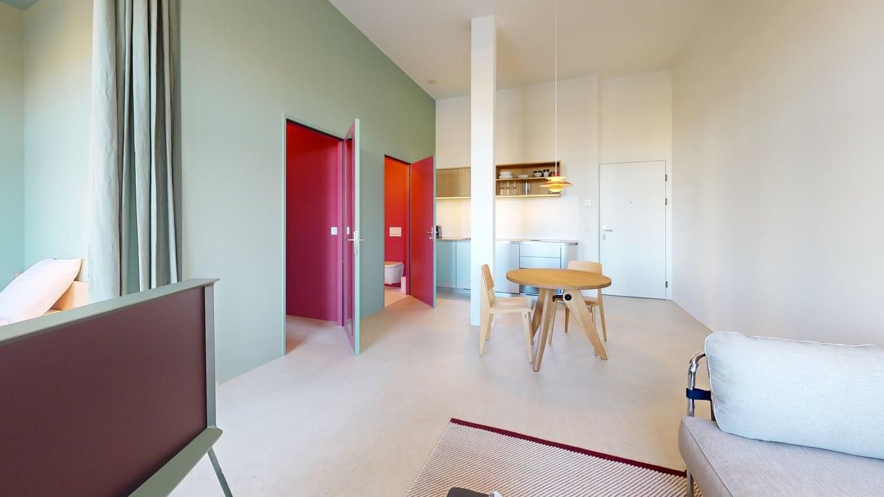 Carefully renovated studio in a historic building full of character and history – quietly located with views over the Rhine – furnished with design classics, featuring a high-quality kitchen and bathroom – access to a shared terrace – restaurants, museums, the ferry, and the Rhine promenade right on your doorstep.