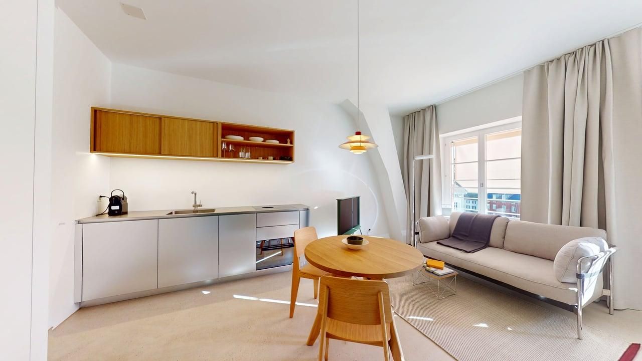 Carefully renovated studio in a historic building full of character and history – quietly located facing the inner courtyard – furnished with design classics, featuring a high-quality kitchen and bathroom – access to a shared terrace – restaurants, museums, the ferry, and the Rhine promenade right on your doorstep.