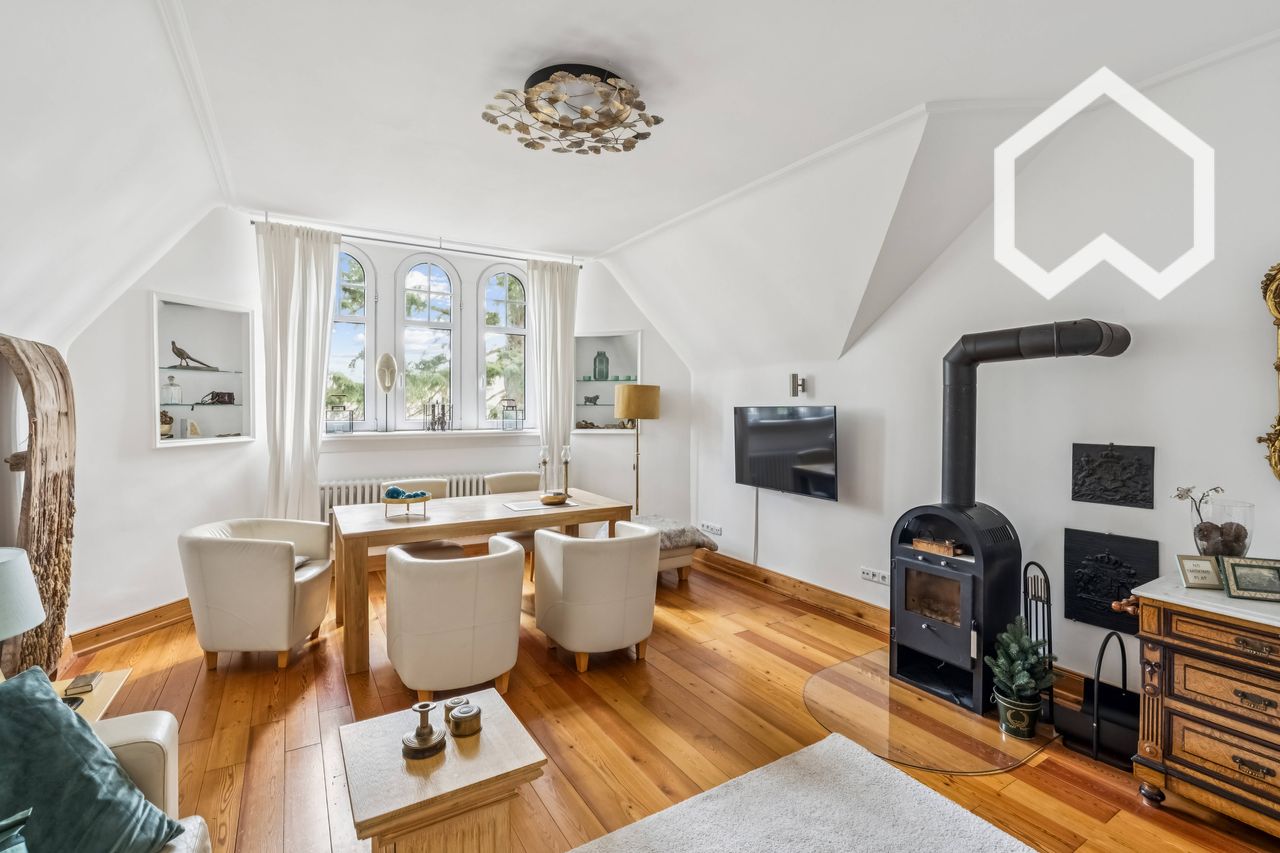 Large apartment 120 sqm on the 2nd floor of anArt Noveau Villa for 1 person; family with up to 2 children by arrangement for an additional charge. 2 bedrooms with double beds, wardrobes, workspaces, and bed linen; 1 office with workspace, wardrobe, chest of drawers, and pull-out sofa; 1 storage room with washing machine, workspace, cleaning equipment; 1 bathroom/shower/WC with mirrored cabinet, towels, hairdryer; 1 living room with sofa and two armchairs, shelves, lamps, TV, dining table with 6...