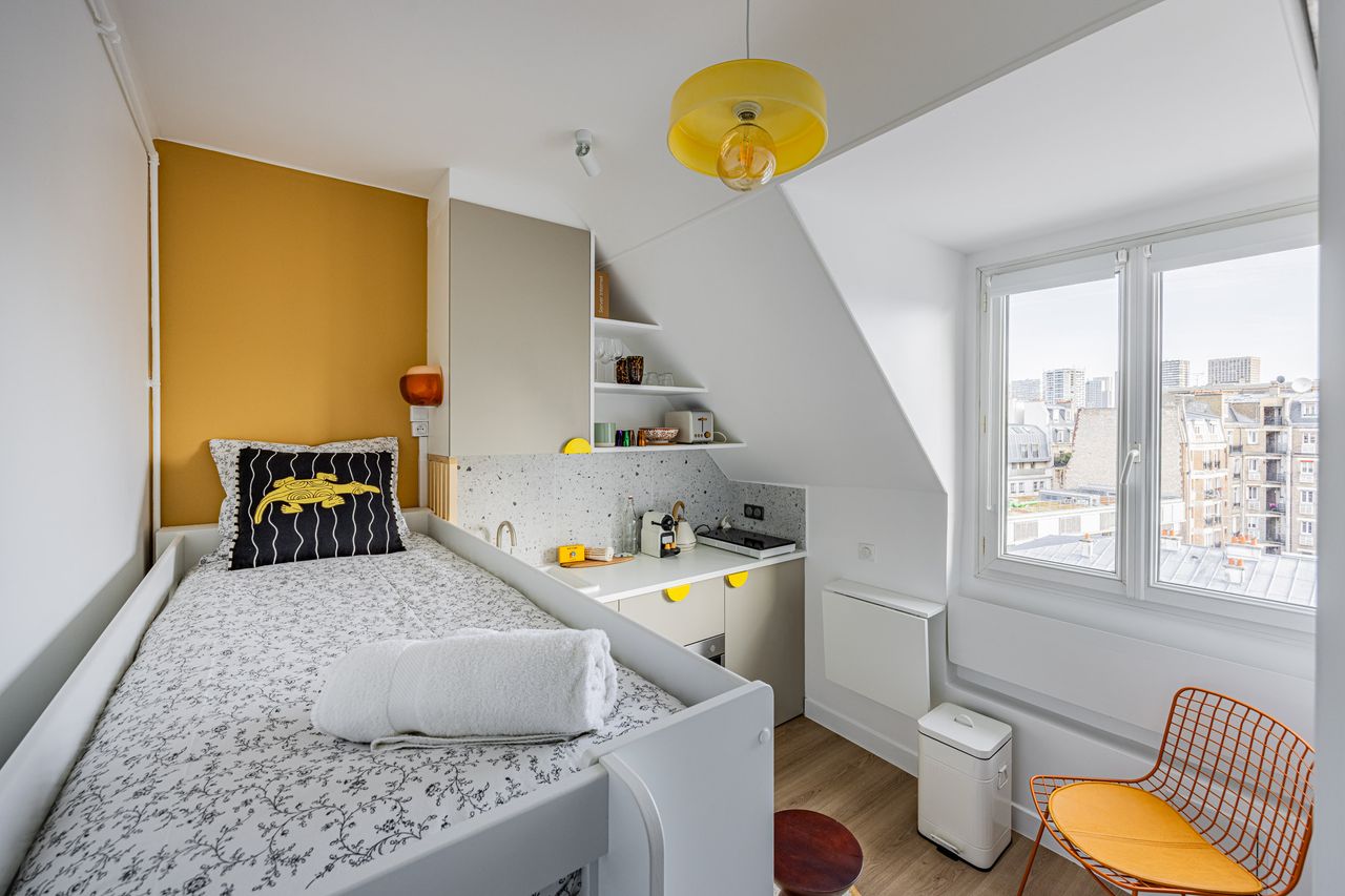Living room Equipped kitchen Single bed with new, high-quality bedding Bathroom with shower Quiet 8th floor, no elevator ⚠️ Toilet located on the landing outside the apartment
