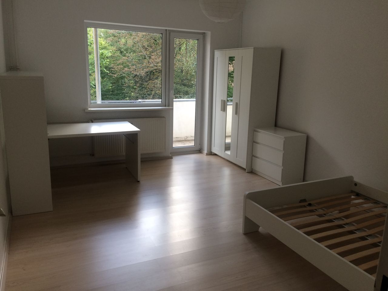 German below Kitchen and bathroom face north toward the street. Both rooms and balcony face south toward the inner courtyard. Kindergarten within earshot, otherwise very quiet. Very sunny. Available for rent for a minimum of 6 months and a maximum of 12 months. The The basic rent includes all utilities. But: Electricity must be registered and paid for by the tenant. Lovingly furnished, see pictures. BATHROOM: Bathtub with glass partition for showering KITCHEN: hob, washing machine, refrigerato...