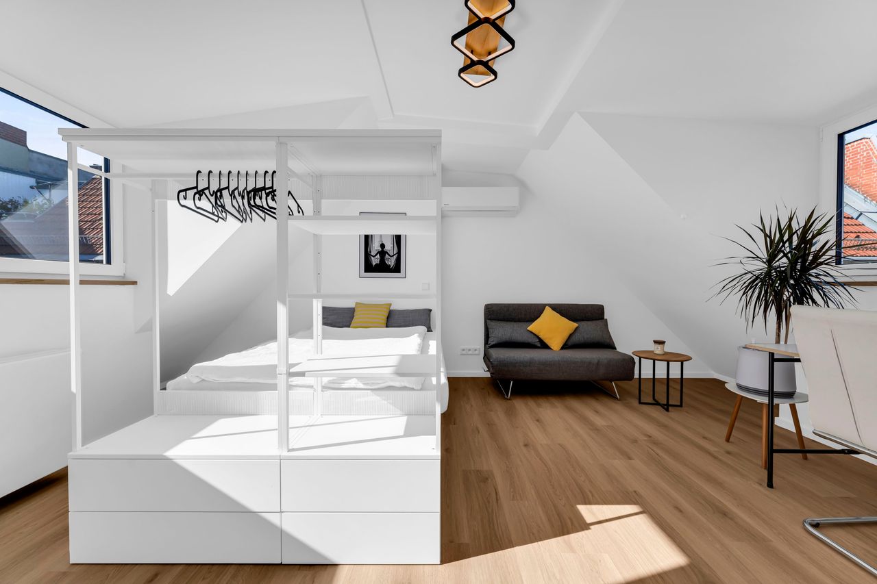 The apartment is on the 5th level, the penthouse apartment, and has an aircondition for warm summers. It's been completely renovated until September 2025. The apartment is very bright, and on a clear day you can see one of Berlins famost sights the Alexanderplatz TV tower (Fernsehturm) from your window. All windows in the apartment are brand new and reach highest standards for insolation. They are on both sides, so you can cross-ventilate and watch the sunrise as well as sunsets.