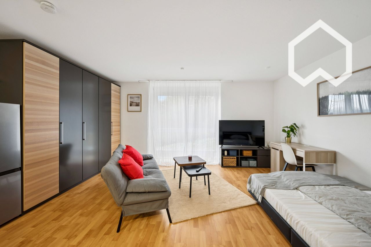 This modernly furnished studio apartment offers a well-designed living concept with a clear layout and a pleasant atmosphere. The bright living and sleeping area is stylishly furnished and harmoniously combines living, working, and relaxation. Large windows provide plenty of natural light, while the calming color scheme creates a timeless ambiance. The new, fully equipped kitchen and the well-maintained bathroom make the apartment ready for immediate occupancy. Ideal for singles, commuters, or a...