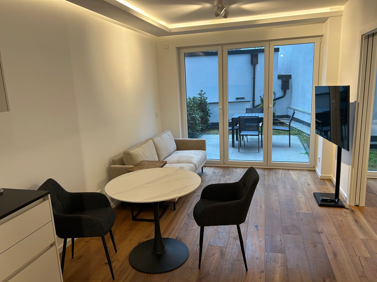 Rare opportunity to rent an exclusive and fully furnished new-build apartment in Nordend-Ost – offering the highest level of living comfort and, if desired, a private underground parking space. First occupancy available immediately or by arrangement. Centrally located yet quiet, on the ground floor of a stylish four-story new building with elevator. The apartment features underfloor heating and air conditioning (separately controlled in the bedroom and living area), a private garden area (over ...