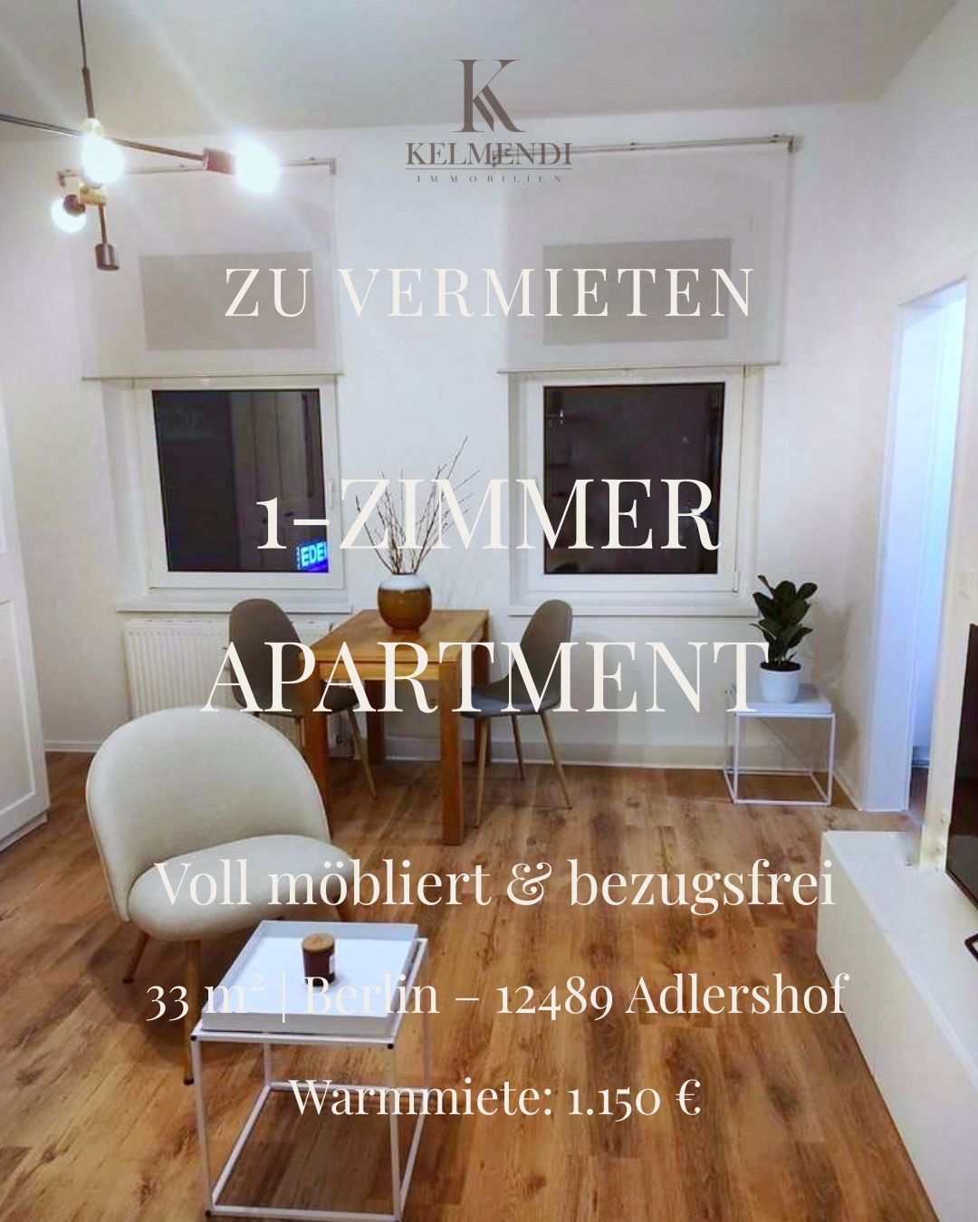 This modern and fully equipped 33 sqm studio apartment is located in the attractive district of Berlin-Adlershof and comes fully furnished and ready to move in. Perfect for professionals, expats or students looking for a compact and comfortable living space in Berlin. Features: Fully furnished TV included Fitted kitchen Refrigerator Kitchen utensils included Bright bathroom Quiet residential area Excellent public transport connections Shops and cafés nearby Warm rent: €1,150 Available immediatel...