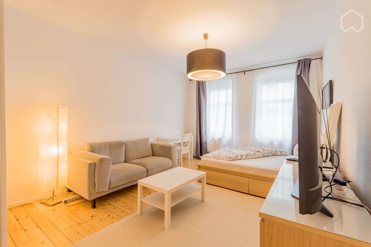 1-Zimmer Wohnung im ruhigen Seitenfluegel gelegen, sie liegt perfekt verkehrstechnisch gelgen an der S-Bahn Bornholmer Str., Gesundbrunnen und Schönhauser Allee mit der Metro U2, U8 und der S-Ringbahn und Nord-/Suedstrecke und erreichen z.B. den Alexanderplatz in ca. 10 Minuten. Die Wohnung besteht aus Kueche mit voller Ausstattung, Badezimmer, Diele und Wohn-/Schlafzimmer.