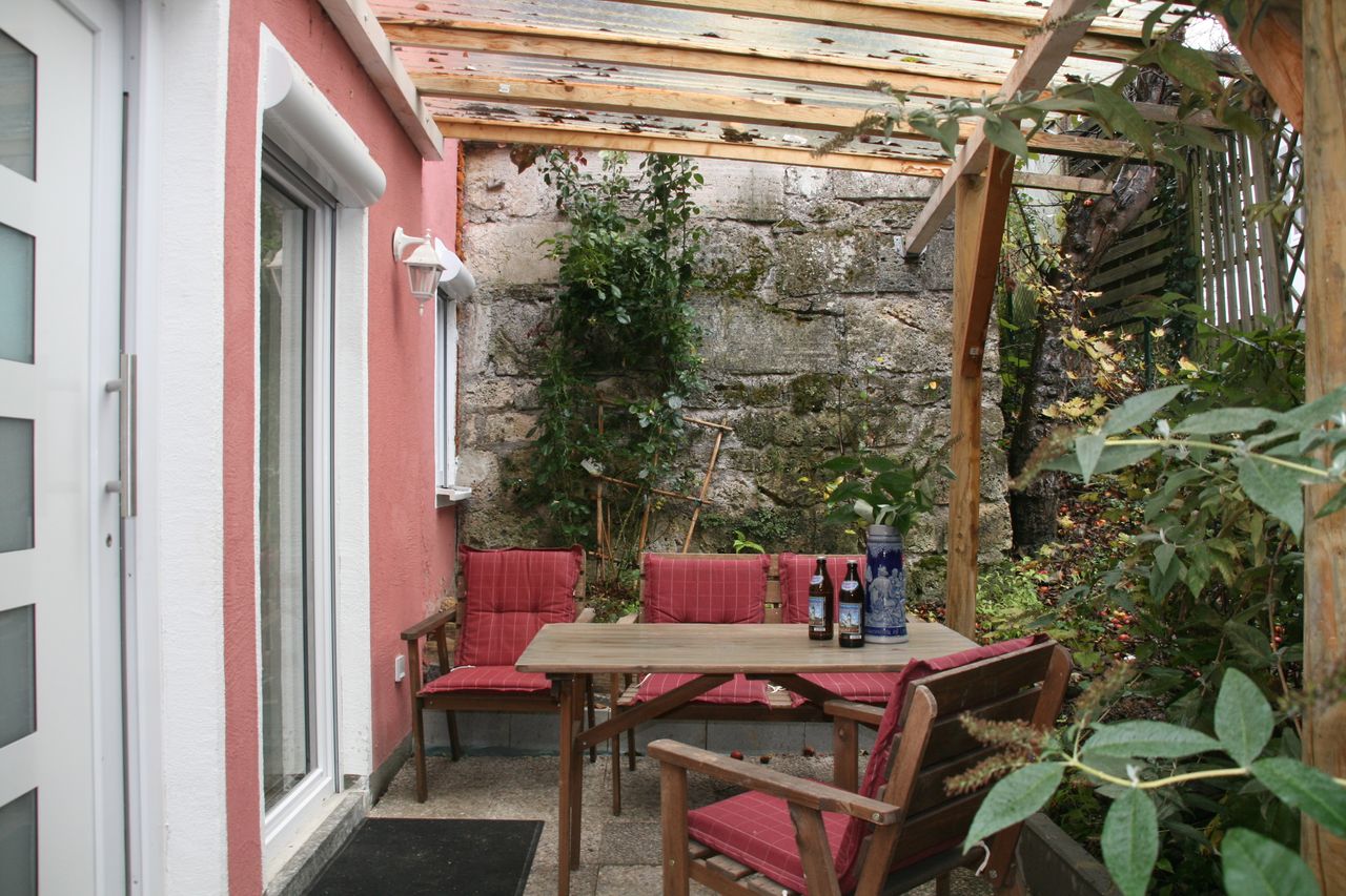 Directly in the greenery is our 2 room vacation apartment for 4 people, 60 m² living space + 8 m² terrace on the lower ground floor. Through the courtyard you reach your separate entrance on the terrace. First you enter a spacious dining room, followed by a large passageway to the living room with a sofa bed. Separately follows the bedroom with double bed and wardrobe and then in the basement the small but fully equipped kitchen and the shower room with washing machine.