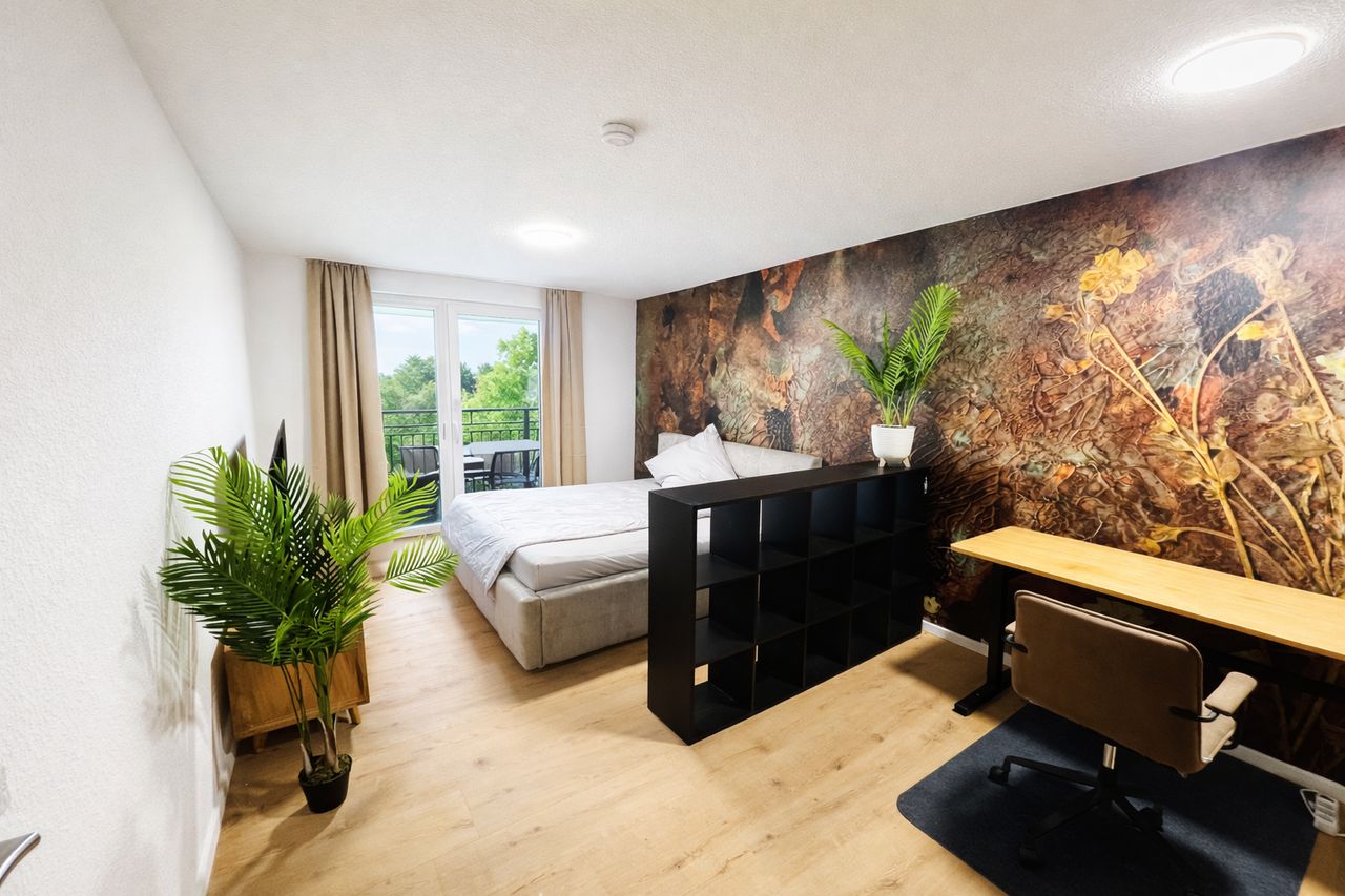 A new tenant is being sought for the spacious master bedroom (approx. 25 m²) with a large balcony in a fully renovated and completely furnished two-room apartment offering approx. 63 m² of living space. The apartment is located in a quiet area of Frankfurt-Niederrad on the second floor of a well-maintained residential building with elevator and provides modern living comfort for professionals looking for a move-in-ready home. The apartment has been renovated to a high standard and comes fully e...