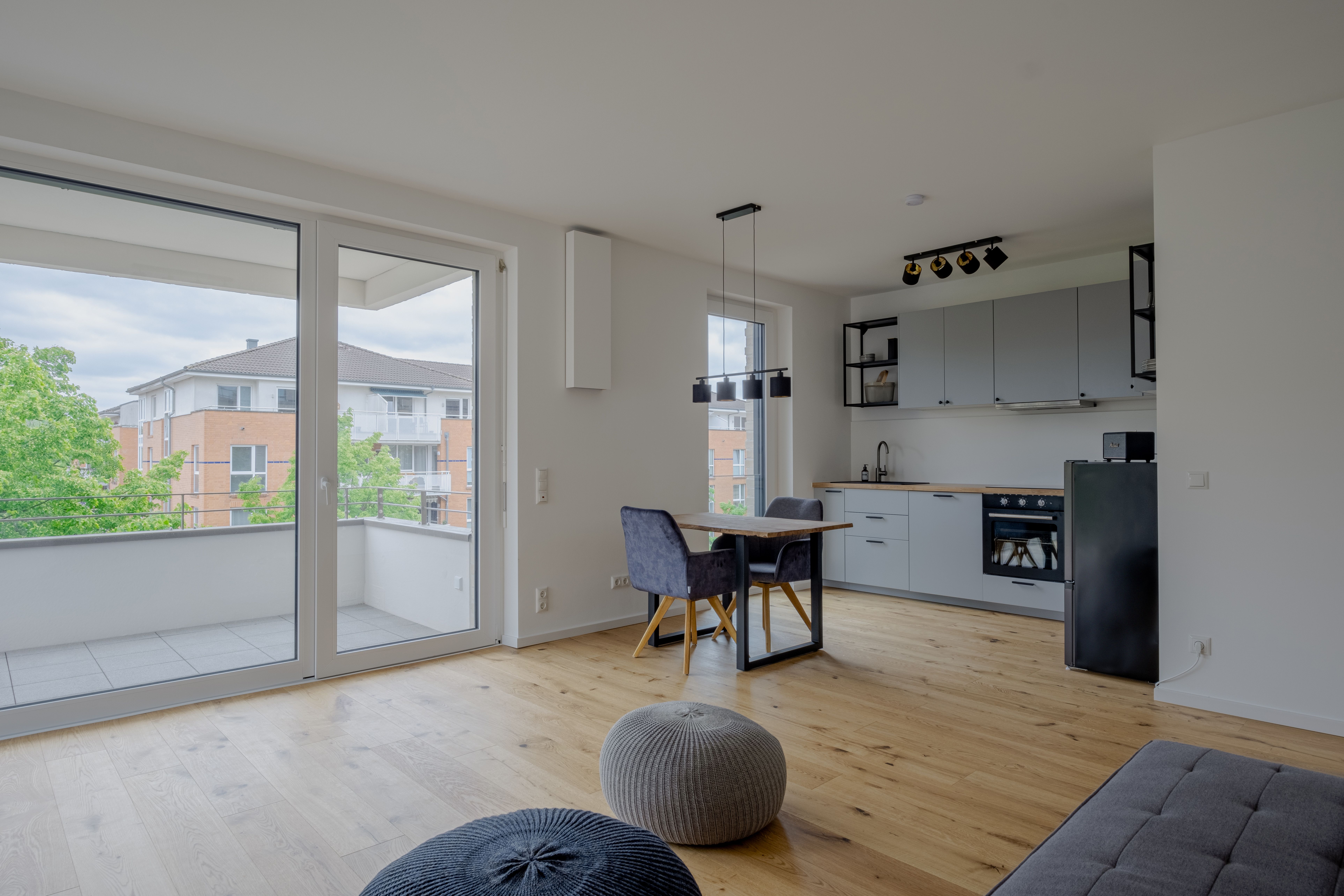 Modern, bright top apartment with balcony, underground parking space & access to private park, 5 min from the main train station in Neuss