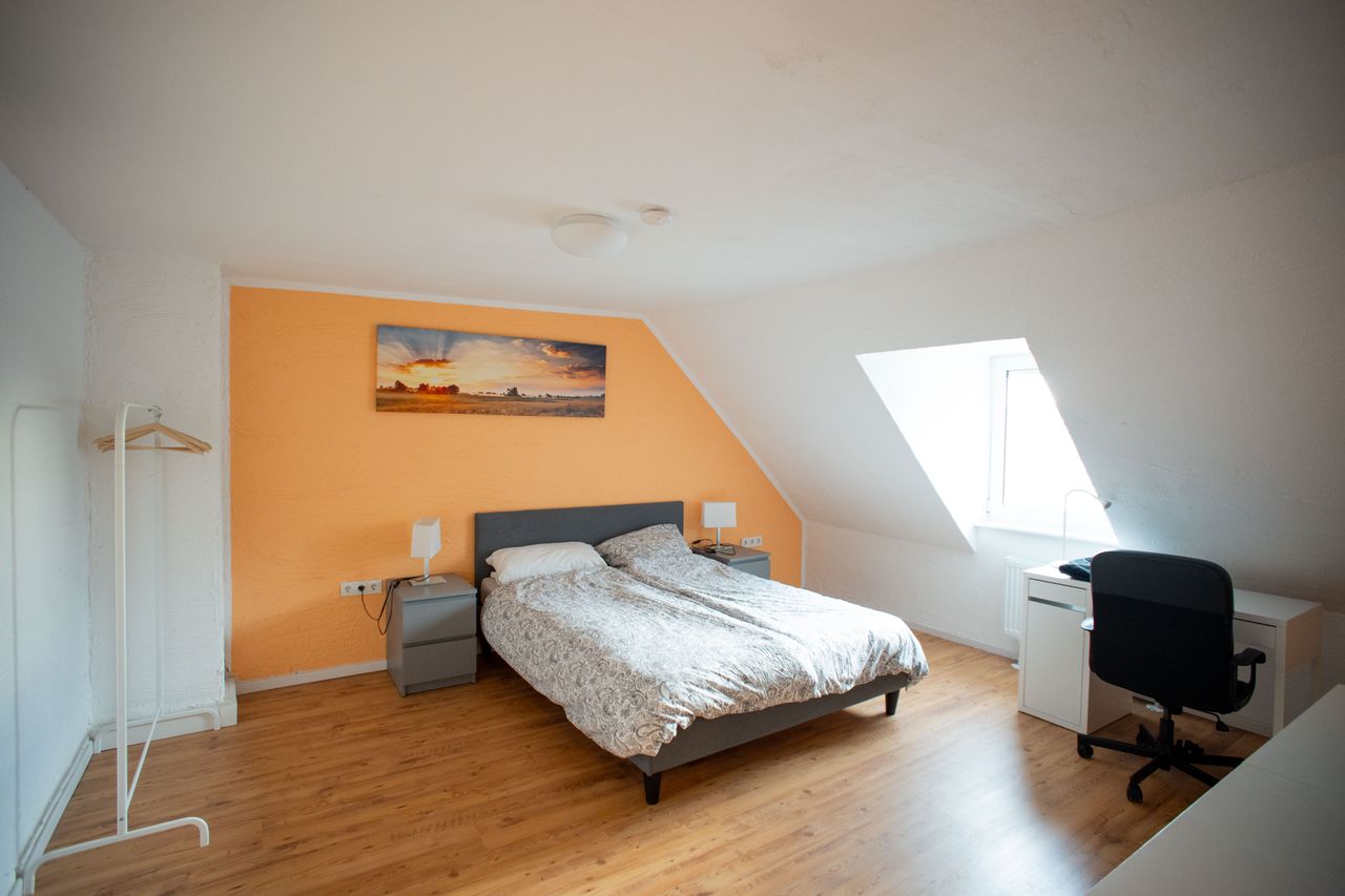 Enjoy your stay in this beautiful, newly renovated apartment above the roofs of Ludwigshafen. In the beautiful attic, you can relax with your friends for a cold beer or a hot mulled wine, depending on the season. The apartment consists of 3 rooms, a kitchen, bathroom with shower, and a heated attic. The kitchen is fully equipped and spacious. Rooms include a desk, clothes rack, chests of drawers, and a double box spring or a single bed in the small room. Towels and bed linen are also provided. ...