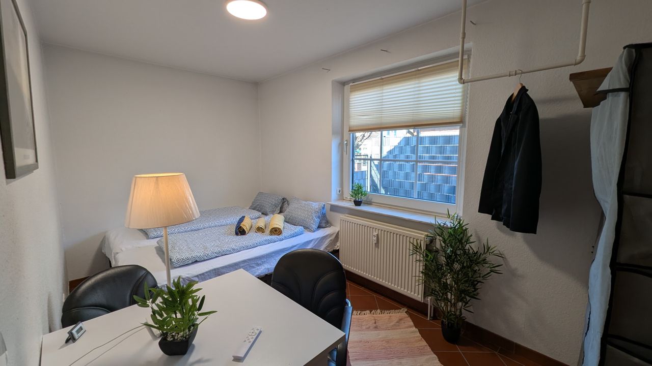 Gemütliche Wohnmöglichkeit – ruhig, ehrlich und unkompliziert Das Zimmer verfügt über einen schönen Terrakotta-Fußboden und ein großes Fenster mit Blick ins Grüne. Ein modernes Plissee sorgt für Abdunkelung und angenehmen Sonnenschutz. Zur Ausstattung gehören: • stabiler moderner Tisch mit zwei Stühlen • Kleiderschrank • hängender Garderobenständer • Bett nach Bedarf: • Einzelbett (90 × 200 cm) oder • Doppelbett (180 × 200 cm) • hochwertige Taschenfederkern-Matratze mit Topper • Bettwä...
