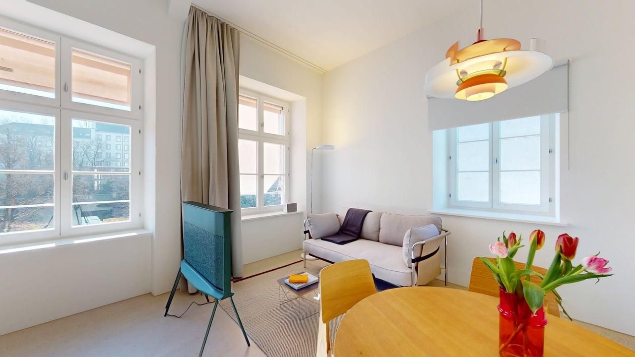 Carefully renovated studio in a historic building full of character and history – quietly located facing the inner courtyard – furnished with design classics, featuring a high-quality kitchen and bathroom – access to a shared terrace – restaurants, museums, the ferry, and the Rhine promenade right on your doorstep.