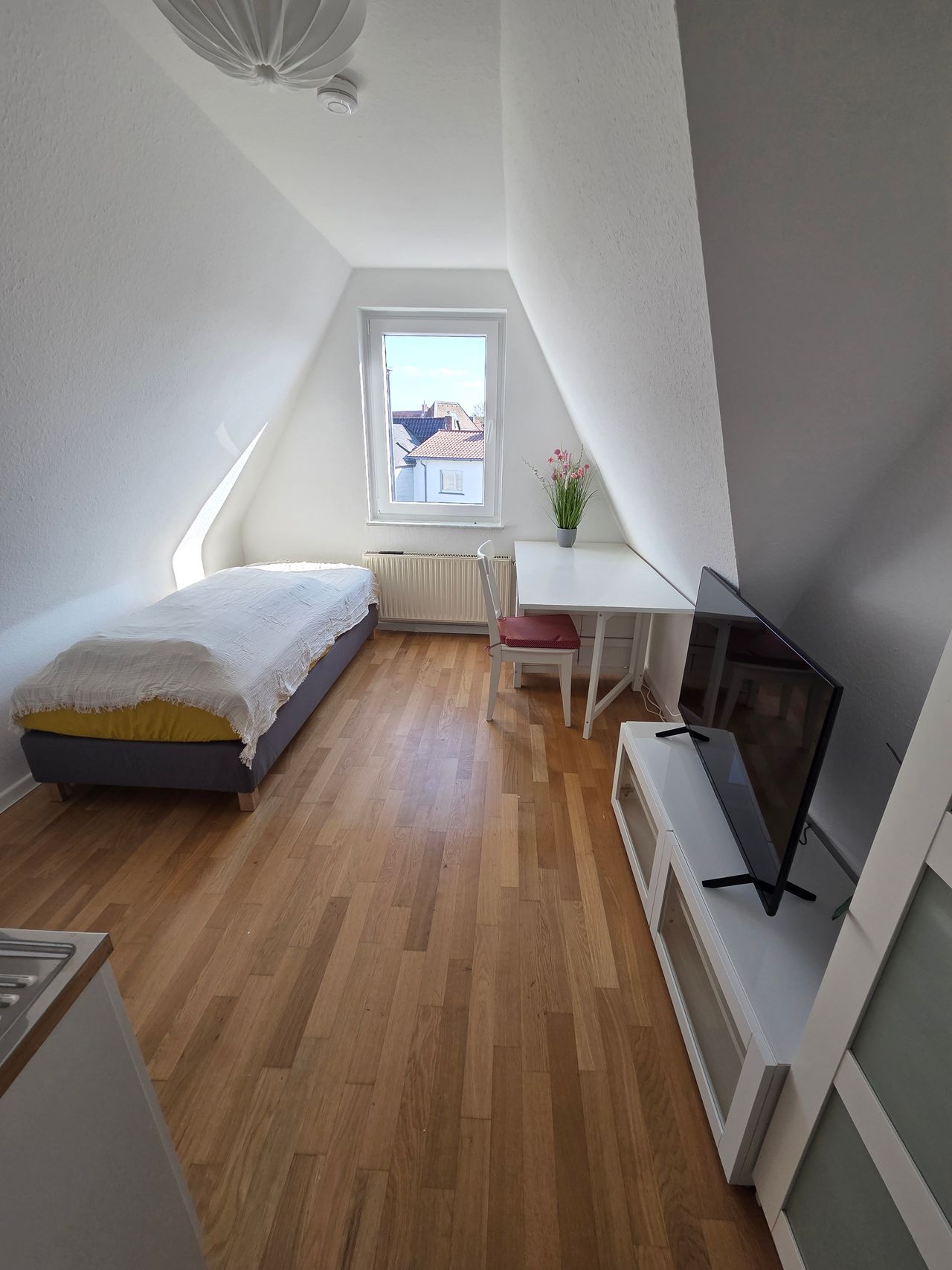 Helles Apartment mit Einzelbett,Tisch ,kleine Küche und Fernseher. Separates Duschbad. Das Zimmer befindet sich in einem Apartmenthaus mit 7 weiteren Zimmern. Öffentliche Verkehrsmittel in der Nähe des Hauses.