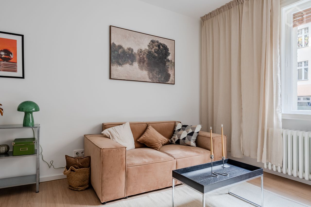 This beautifully renovated and fully furnished 2-room apartment (44 sqm) offers modern living comfort in a central Berlin location. The apartment is rented fully furnished with all utilities included. The bright living room (over 20 sqm) features a comfortable seating area, TV, and dining/workspace. The separate bedroom (approx. 10 sqm) is furnished with a cozy bed and storage space, providing a quiet and relaxing atmosphere. The modern kitchen is fully equipped for daily use. The newly design...