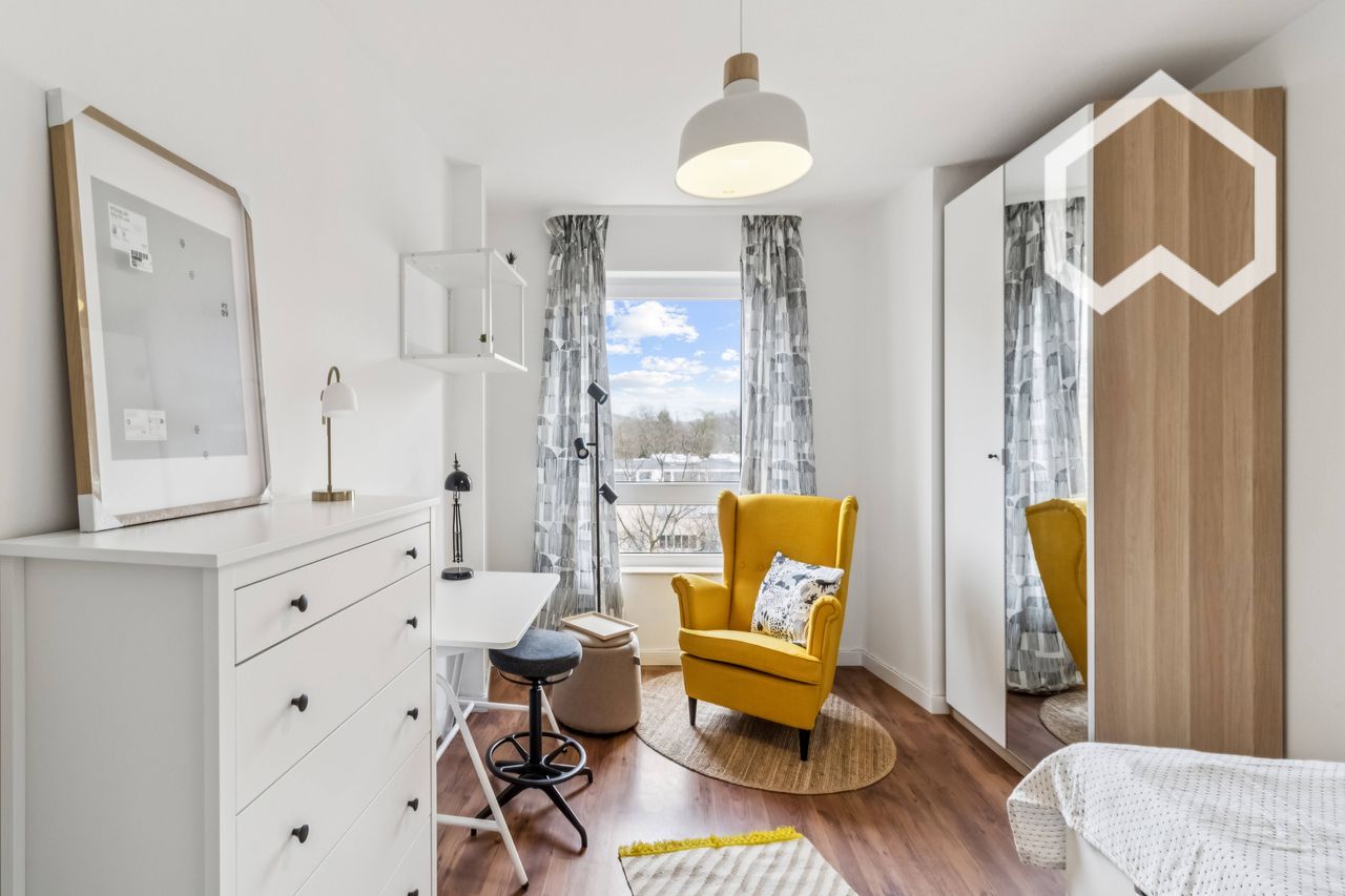 All three rooms are identical and furnished to a high standard – ideal for a fair division of shared accommodation. Each room has: • Bed • Wardrobe • Armchair • Height-adjustable desk • Ergonomic office chair This makes the apartment perfect for concentrated study and work as well as for relaxing after a long day. The modern, fully equipped kitchen invites you to cook together, and the contemporary bathroom rounds off the comfortable living space. The apartment has been extensivel...