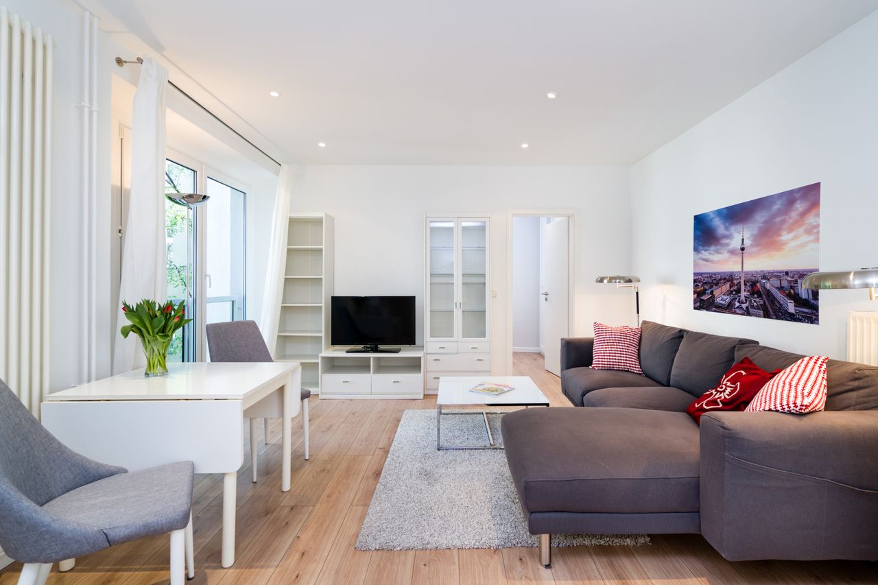 Our apartment is very sunny, quietly located in the rear building with a view of the leafy courtyard. Everything is modern and new: living room with comfortable sofa, armchairs, chests of drawers, Smart TV, WiFi, dining table and matching chairs. Open kitchen with fridge/freezer, dishwasher, washer-dryer, stove, oven, dishes, all cooking utensils. Bedroom with double bed and wall unit. Bathroom with bathtub and glass shower wall, large shelves. Hallway with additional wardrobe and shoe cupboard....
