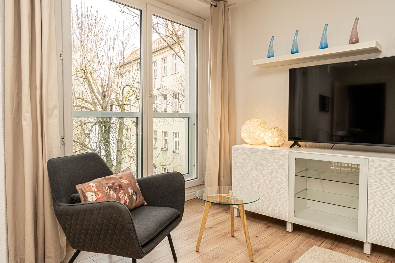 Very chic and modern 2 room apartment available again: Living room with cozy sitting area, sideboard, TV, extendable dining table/chairs, TV armchair, working table, free view into the green backyard, absolutely quiet, morning sun. Open kitchen with all appliances such as dishwasher, washer-dryer, fridge/freezer, Nespresso machine, toaster, dishes, etc. Hallway with another large cupboard for wardrobe and cleaning utensils. In addition to the usual utility costs, the rent also includes WiFi, G...