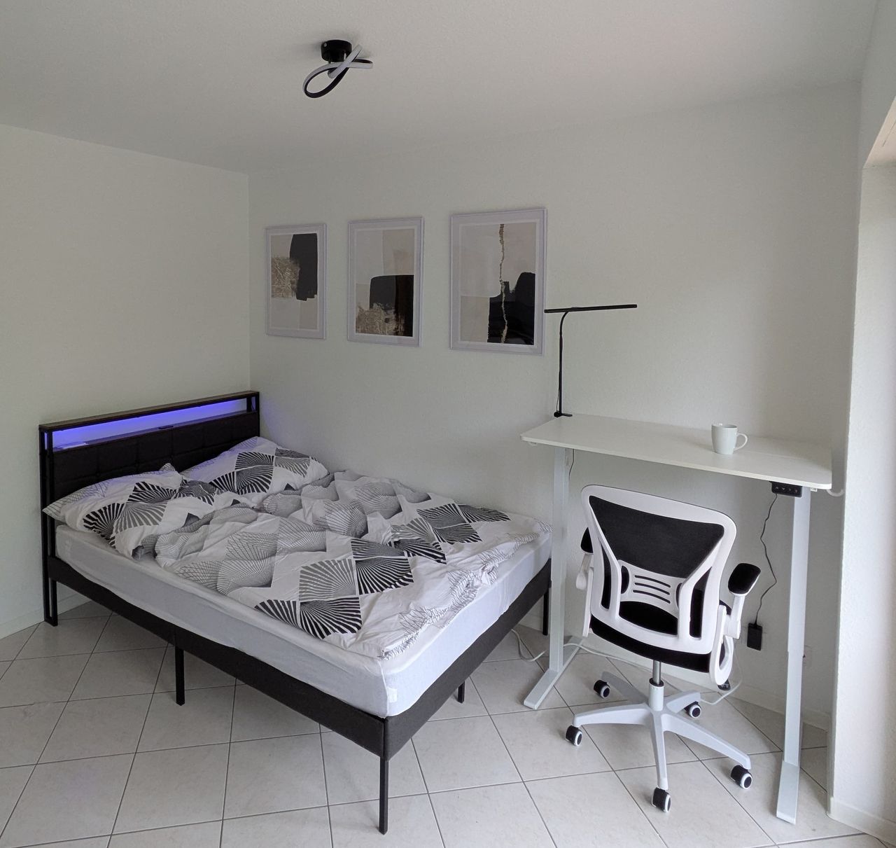 This modern one-room apartment is on the first floor of a quiet and well-kept building in a popular area of Karlsruhe-Rintheim. It is fully furnished and equipped with everything you need for comfortable living and working: There's a cozy living and sleeping area with a double bed, an electric height-adjustable desk, a flat-screen TV, and a small dining area. A large wardrobe offers plenty of storage. The bathroom is newly renovated and has a walk-in shower with mosaic tiles and a washing machin...